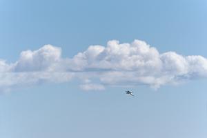 A bird coasts through a beautifully simple blue sky with puffy white clouds. A moment that gave me some peace.