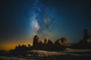 Site of filming for Stark Trek, Star Wars and more - Trona Pinnacles in Southern California are seen on a dark sky night with the visible Milky Way and stars.