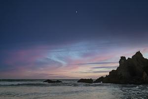 The Moon looks over El Matador beach in Malibu, California as the last of sunset hangs onto the horizon.