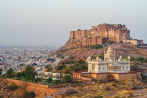 Jaswant Thada, and behind it Mehrangarh Fort, seen during the glow of sunrise in Jodhpur.