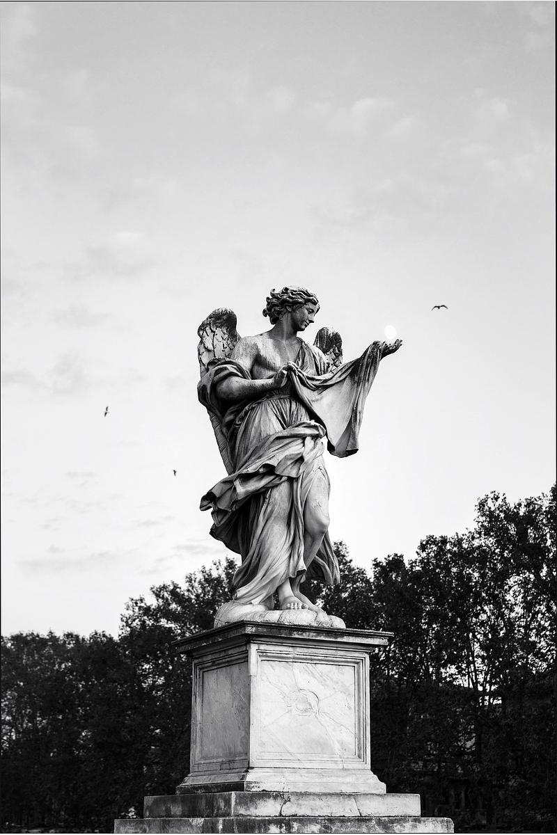A statue on Rome's Ponte Sant'Angelo is seen holding the moon just after sunset on a glorious winter evening while starlings circling in the sky overhead.