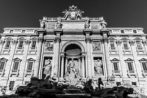 Rome's Trevi Fountain is seen on a sunny day with all its details ablaze in the sun. Rendered in black and white, it's as timeless an image as the fountain itself.