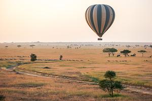 This is part of a series shot at dawn and sunrise while riding in a hot air balloon over Tanzania's Serengeti National Park during the Great Migration when dazzles of zebras filled the ground beneath our balloon. The pink tint is because of the hazy atmosphere and the bright, sunrise light.