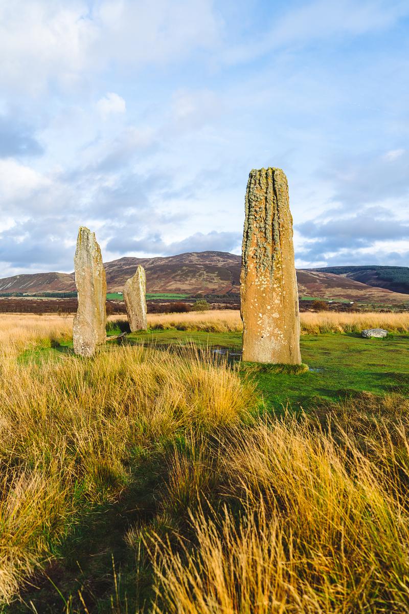 Three of the Machrie Moor Standing Stones are seen in the light of Golden Hour on Scotland's Isle of Arran which is known as "Scotland in Miniature."