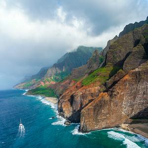 Kauai's colorful, dramatic Na Pali Coast is seen on a stormy day between rain showers when the sun briefly came out and a boat entered the vista. This image was taken from a helicopter flight over the coastline.