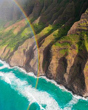 Kauai's colorful, dramatic Na Pali Coast is seen up close on a stormy day between rain showers when the sun briefly came out and in this frame, a rainbow appeared! It's meant as a companion to the 'Na Pali Coast' photo also for sale in this gallery. Image was taken from a helicopter flight over the coastline.
